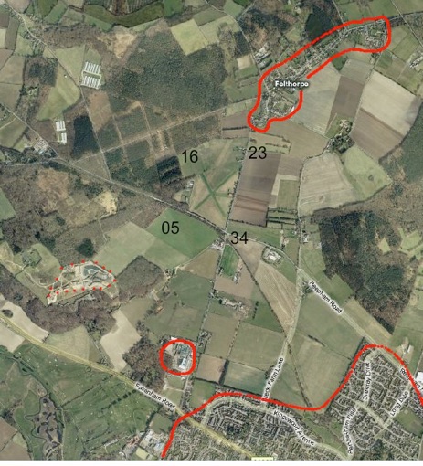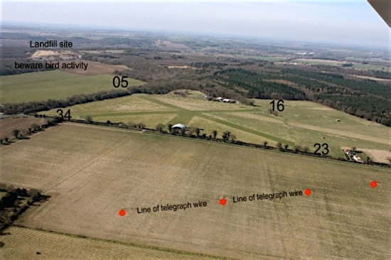 Caution: 1.5m wire fence at threshold RW16; possible turbulence on short final over the trees RW 16; telephone cables on final to RW23 (marked with orange balls). Landfill site (dotted red line) – increased bird activity. Avoid Taverham and Felthorpe villages, and the Taverham garden centre.